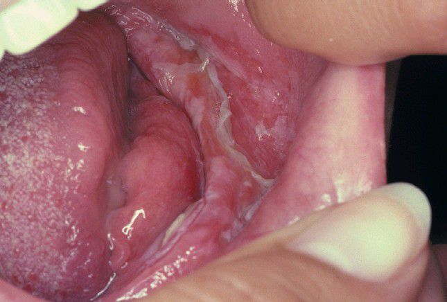 Extensive epithelial necrosis of the mandibular alveolar mucosa on the left side. Damage resulted from placement of an over-the-counter, phenol-containing, antiseptic and anesthetic gel under a denture.