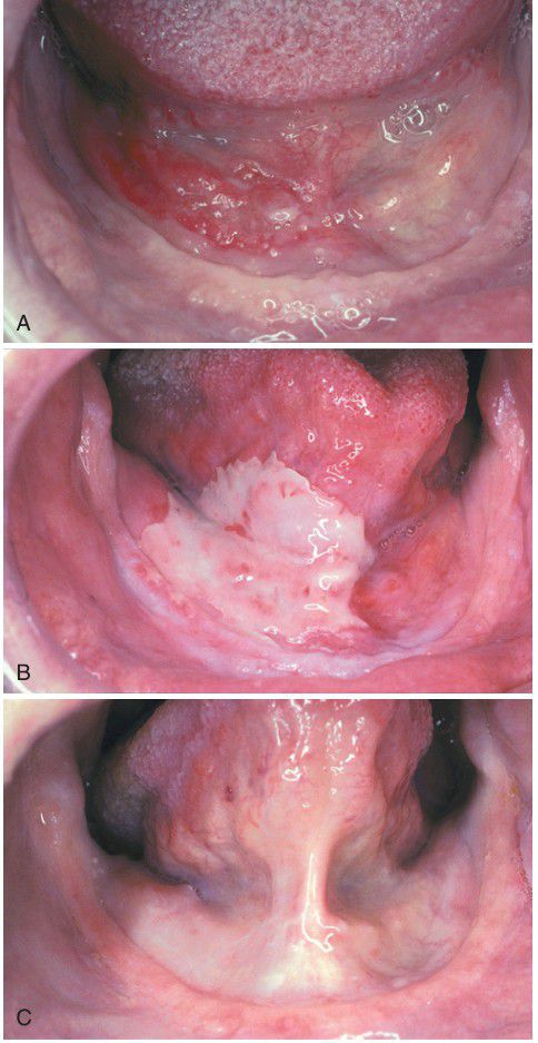 A, Squamous cell carcinoma before radiation therapy. Granular erythroplakia of the floor of the mouth on the patient’s right side. B, Same lesion after initiation of radiation therapy. Note the large, irregular area of epithelial necrosis and ulceration of the anterior floor of the mouth on the patient’s right side. C, Normal oral mucosa after radiation therapy. Note resolution of the tumor and the radiation mucositis.