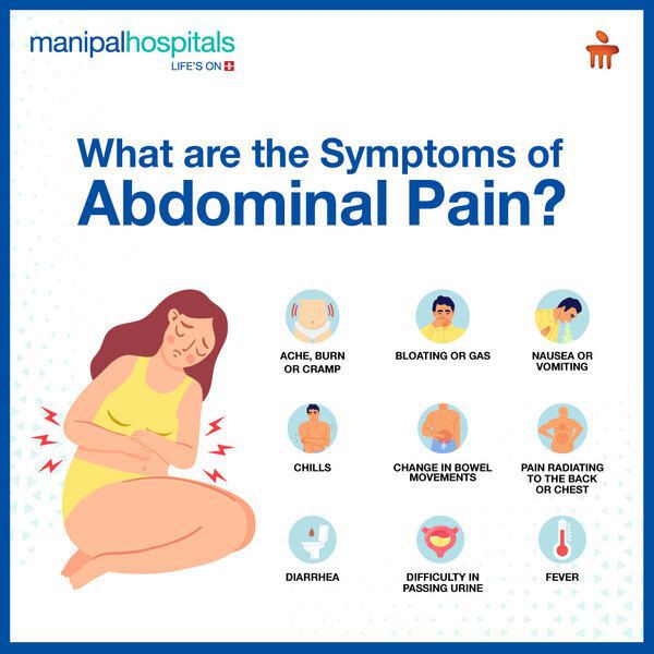 The pain may also be accompanied by other symptoms, such as: bloating, belching and burping. loss of appetite. heartburn. nausea and vomiting. a change in bowel habits (doing a poo) — including diarrhoea or constipation. problems with urinating (doing a wee) fever.