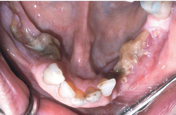 . Bilateral necrotic exposed bone of the mandible in a patient receiving zoledronic acid for metastatic breast cancer.