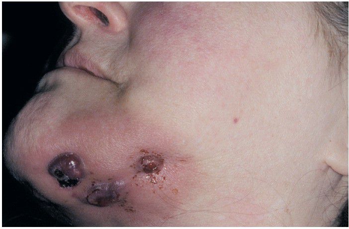 Patient with multiple cutaneous sinuses associated with extensive necrosis of the left side of the mandible. The patient was taking zoledronic acid for multiple myeloma.
