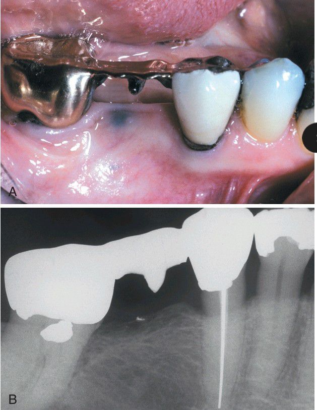 . A, Area of mucosal discoloration of the mandibular alveolar ridge immediately below the bridge pontic. B, Radiograph of the same patient showing radiopaque metallic fragment present at the site of mucosal discoloration.