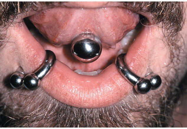 . Lower lip pierced bilaterally with labrets consisting of a circular rod with terminating balls. The patient also has a lingual barbell.