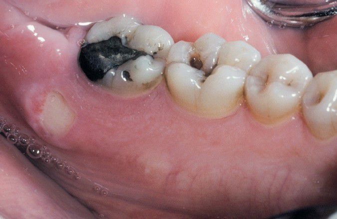 . Mucosal ulceration with exposed bone of the posterior lingual surface of the mandible