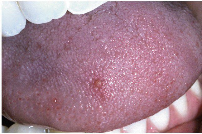 . Tender, yellow-pink papule on the dorsum of the tongue.