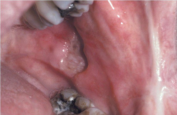 Large, deep, and irregular ulceration of the posterior buccal mucosa. Note extensive scarring of the anterior buccal mucosa from previous ulcerations