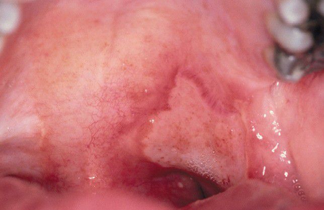 . Large, irregular ulceration of the soft palate.