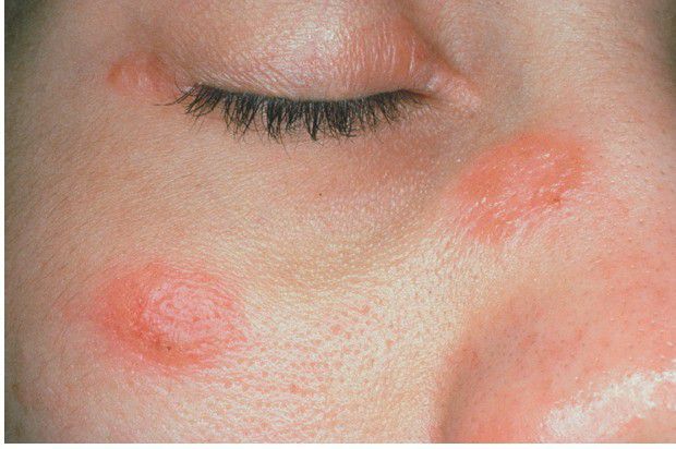 . Violaceous indurated plaques of the right malar area and bridge of nose.