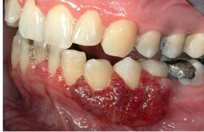 . Hyperplastic and hemorrhagic mucosa of the facial mandibular gingiva on the left side.