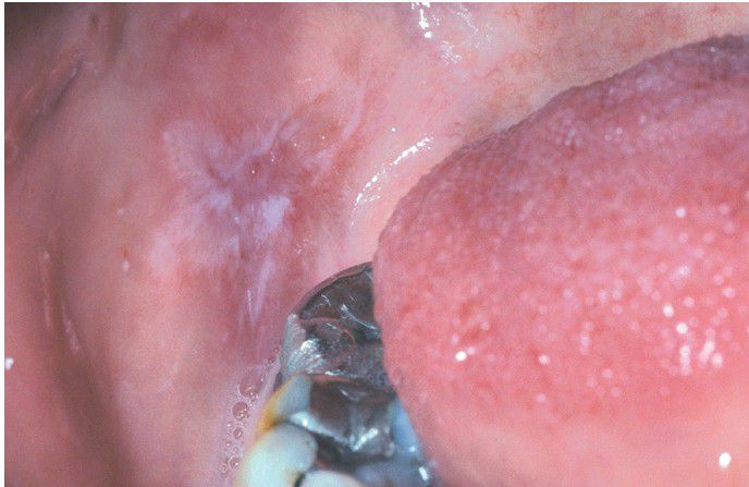 . Radiating pattern of hyperkeratotic striae on the posterior buccal mucosa that contacts a large distobuccal amalgam of the permanent mandibular second molar.