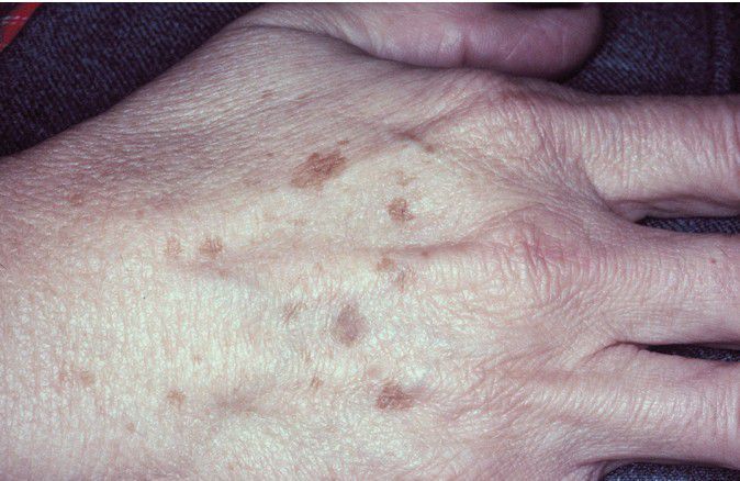 . Multiple lesions on the sunexposed skin of the hand of an older adult. Lesions are brown macules with irregular borders.