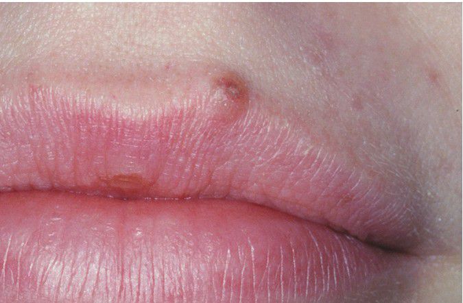 . A well-demarcated, lightly pigmented, dome-shaped papule is seen at the edge of the vermilion border of the upper lip.