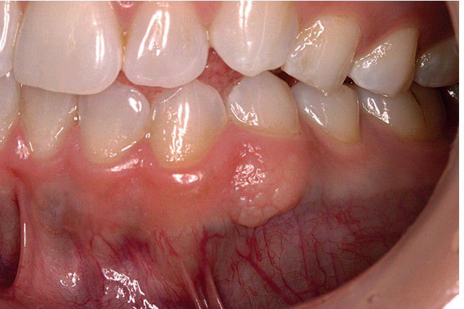 . This intramucosal nevus of the mandibular gingiva is nonpigmented. (Courtesy of Dr. James Jacobs.)