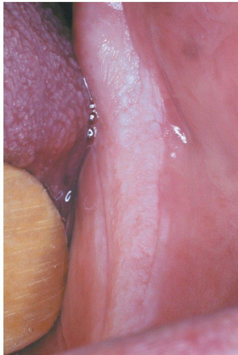 . There is a rough, hyperkeratotic change to the posterior mandibular alveolar ridge (“alveolar ridge keratosis”), because this area is now edentulous and becomes traumatized from mastication. Such frictional keratoses should resolve when the source of irritation is eliminated and should not be mistaken for true leukoplakia.