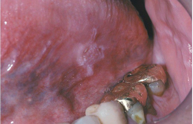 . Focal leukoplakic lesion with a rough, granular surface on the posterior lateral border of the tongue. Biopsy revealed early invasive squamous cell carcinoma.