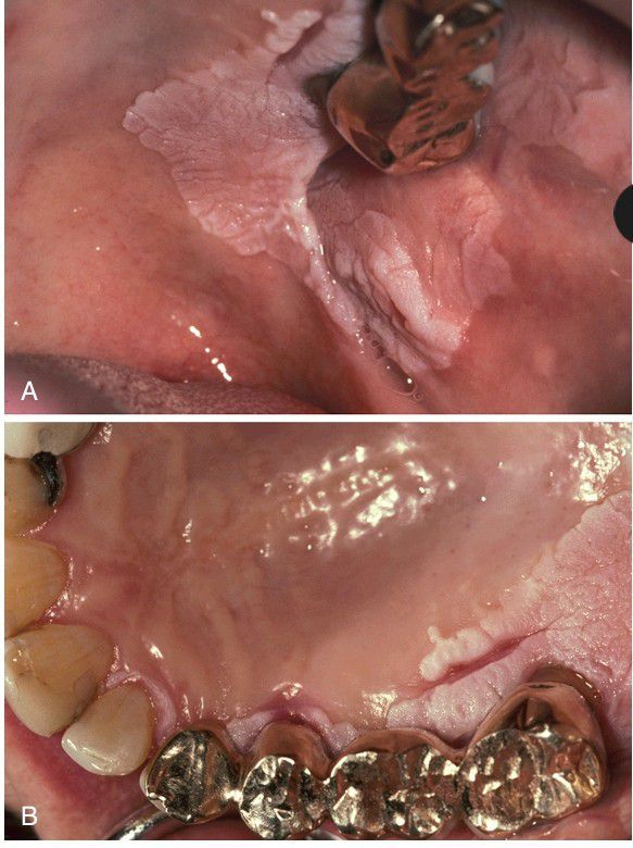 A, Diffuse, corrugated, white lesions of the buccal and palatal mucosa. B, Thickened, corrugated, white lesion involving the palate, alveolar ridge, and lingual marginal gingiva.