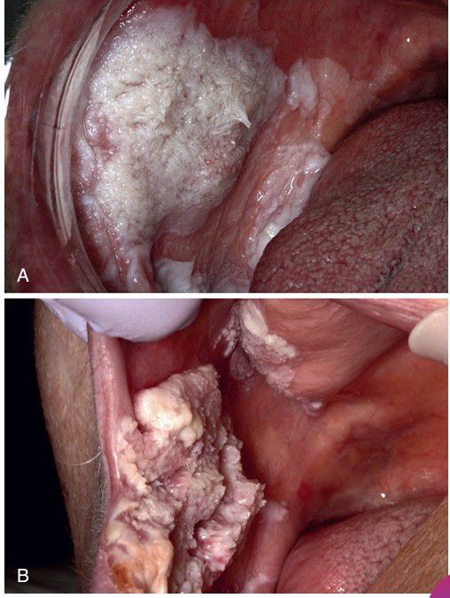 A, An elderly white female developed extensive leukoplakia with rough surface projections on the buccal mucosa and mandibular alveolar ridge. B, After failing to comply with a recommendation for biopsy, the same patient returned 2 years later with a verrucous carcinoma.