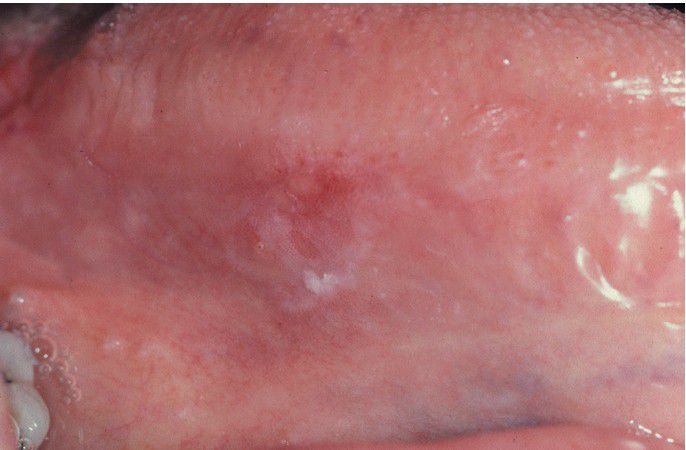 . Red and white lesion of the lateral border of the tongue. Biopsy revealed carcinoma in situ.