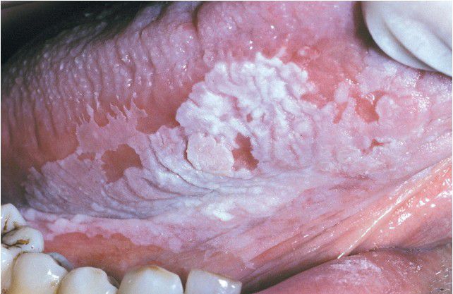 . Extensive ventral and lateral tongue lesion with areas representing various possible phases or clinical appearances