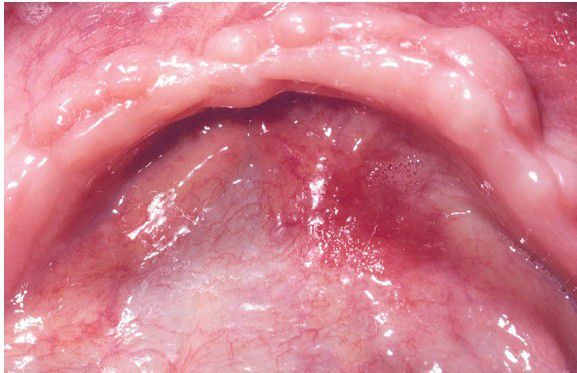 . Erythematous macule on the right f loor of the mouth. Biopsy showed early invasive squamous cell carcinoma.