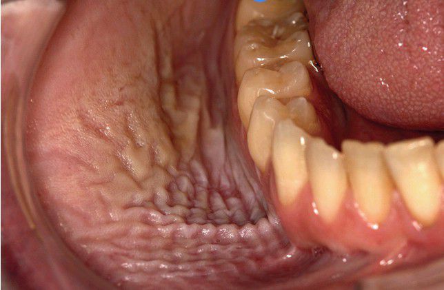 . A somewhat leathery, white, fissured plaque of the right mandibular vestibule, which was located in the area of chronic chewing tobacco placement.