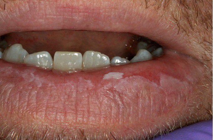 . Diffuse, irregular white plaque at the wet line of the lower lip vermilion.