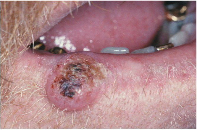 . This lesion, which is located at the outer edge of the vermilion border of the lip, demonstrates a prominent core or plug of keratin.