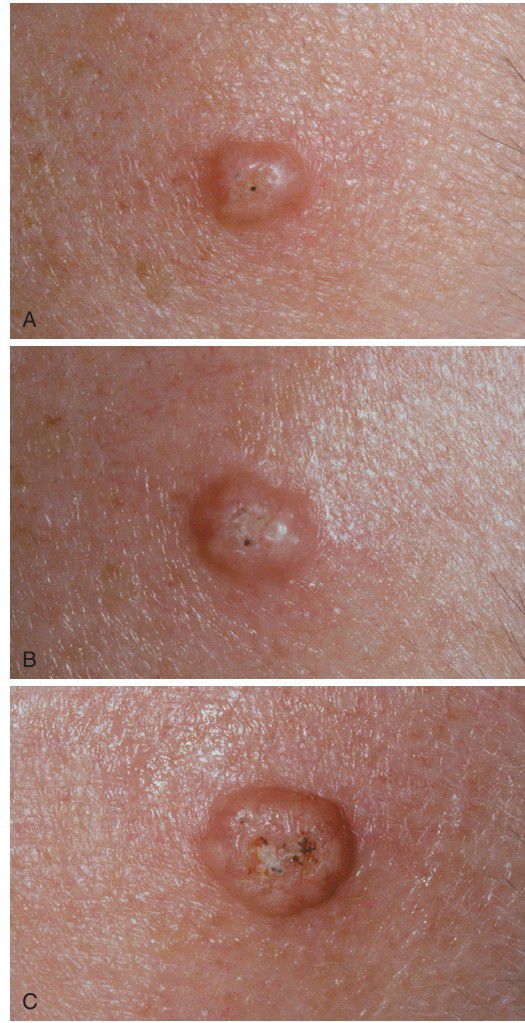 . A, Appearance on initial presentation. Note small, central keratin-filled invagination. B, Same lesion 1 week later showing slight enlargement. C, Same lesion showing further growth 3 weeks after initial presentation. All three photographs were taken at the same magnification.