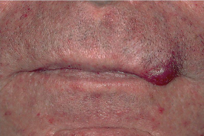 Red nodule on the vermilion border of the upper lip.