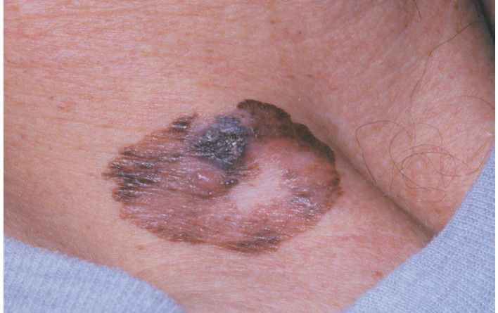 . This lesion on the neck demonstrates the ABCDE warning signs of melanoma: Asymmetry, Border irregularity, Color variegation, Diameter larger than a pencil eraser, and Evolving larger size.