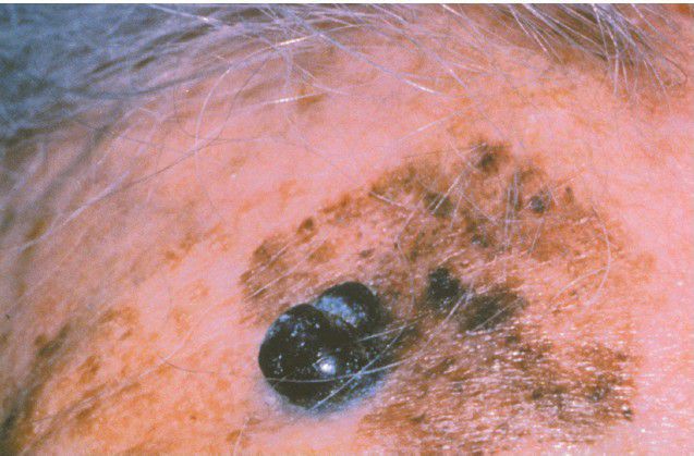. A slowly evolving pigmented lesion of the facial skin in an older adult man.