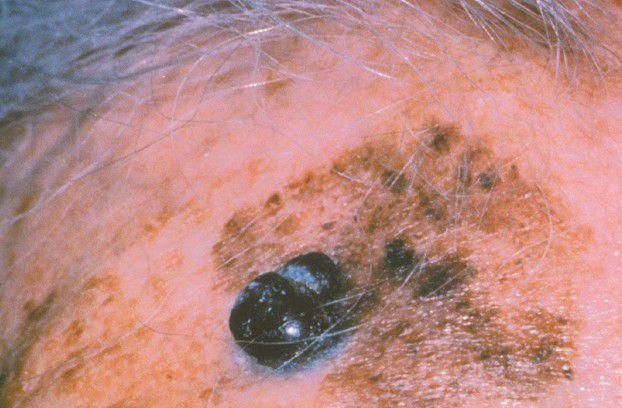 A slowly evolving pigmented lesion of the facial skin in an older adult man.
