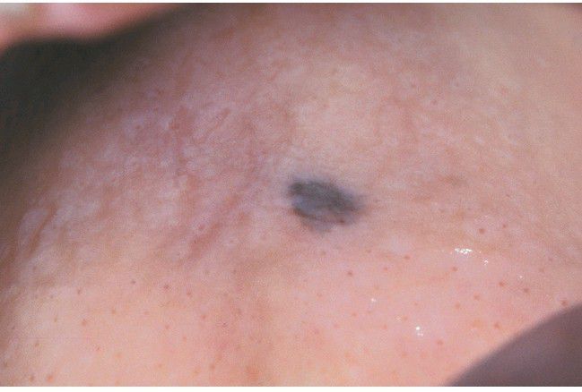 This discrete area of pigmentation, measuring approximately 5 mm in diameter, was discovered on the posterior hard palate of a middle-aged woman during a routine oral examination. Biopsy revealed melanoma in situ.
