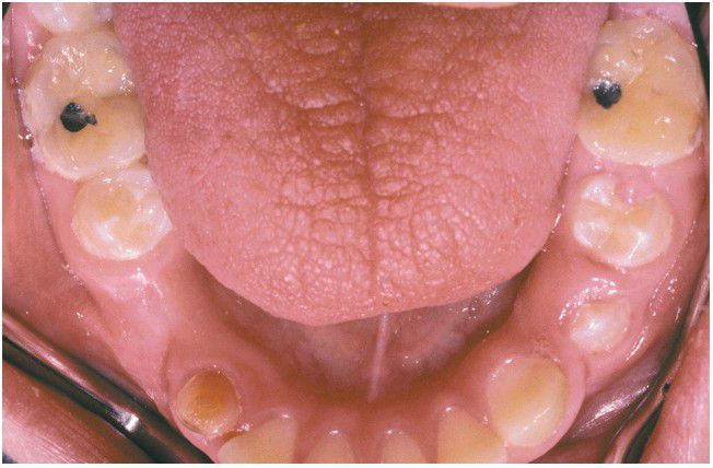 . Dry, leathery tongue and diffuse enamel erosion in a child with aplasia of the major salivary gland