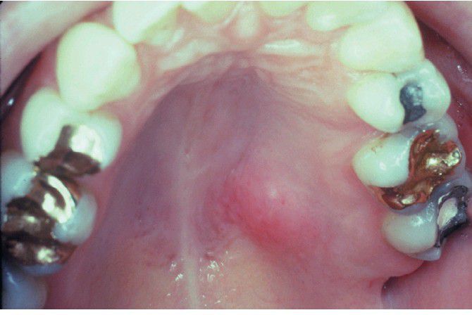 . Early lesion demonstrating swelling of the posterior lateral hard palate.