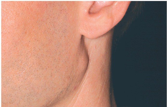 Pleomorphic Adenoma. Small, firm nodule located below the left ear in the parotid gland.