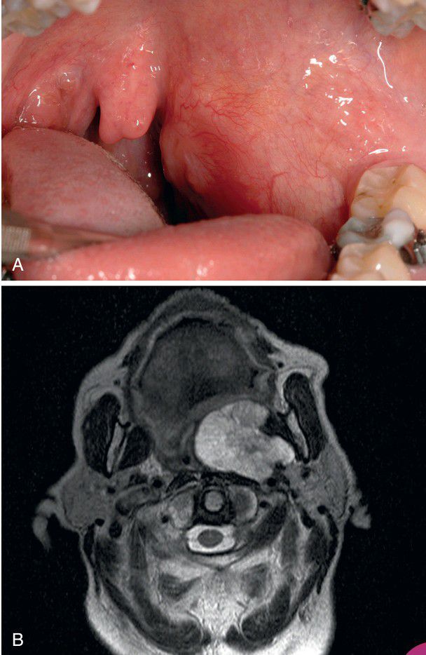 . A, Large tumor from the deep lobe of the parotid gland, which has resulted in a firm mass of the lateral soft palate. B, Contrast-enhanced axial magnetic resonance image (MRI) of a tumor of the deep lobe of the parotid gland.