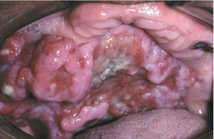 . Granular exophytic and ulcerated mass filling the vault of the palate.