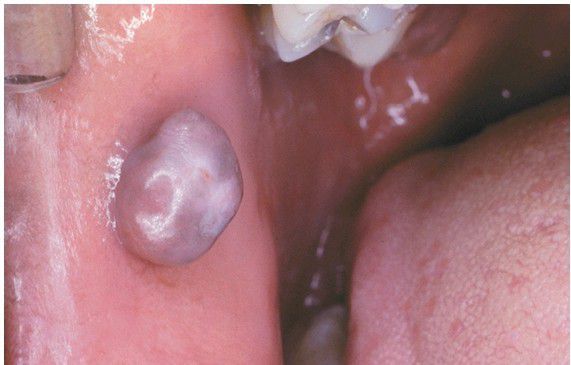 . Black patient with a smooth-surfaced pigmented nodule on the buccal mucosa near the commissure.