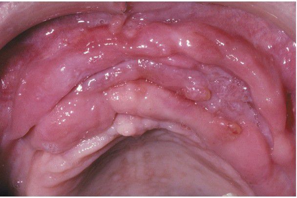 . Hyperplastic folds of tissue in the anterior maxillary vestibule.
