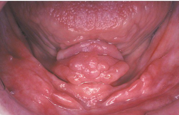 Redundant folds of tissue arising in the floor of the mouth in association with a mandibular denture.