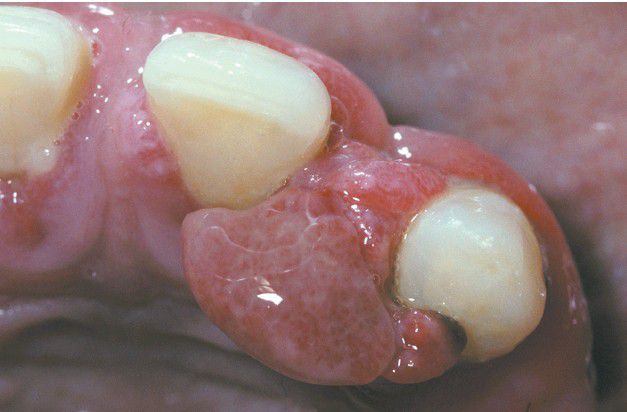 Erythematous, hemorrhagic mass arising from the maxillary anterior gingiva.