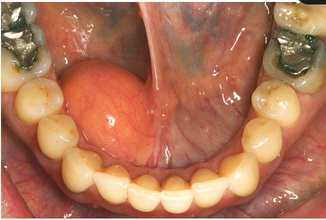 Soft, yellow nodular mass in the floor of the mouth.