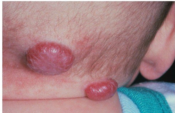 . Infant with two red, nodular masses on the posterior scalp and neck (“strawberry” hemangiom