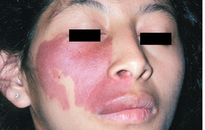 Nevus flammeus of the malar area in a patient without Sturge-Weber syndrome. Unless the vascular lesion includes the region innervated by the ophthalmic branch of the trigeminal nerve, usually the patient does not have central nervous system (CNS) involvement.