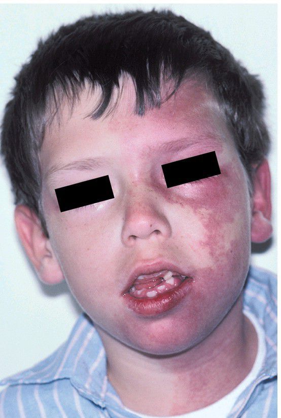 Port wine stain of the left face, including involvement along the ophthalmic branch of the trigeminal nerve. The patient also was intellectually disabled and had a seizure disorder.