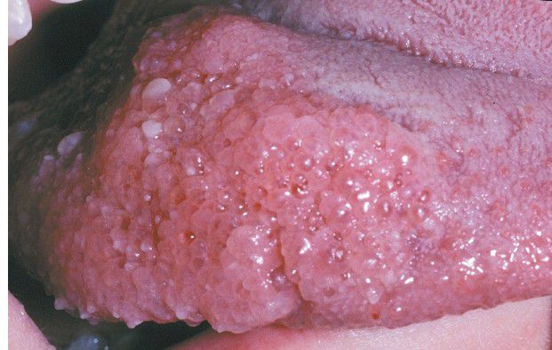 Pebbly, vesicle-like appearance of a tumor of the right lateral tongue.