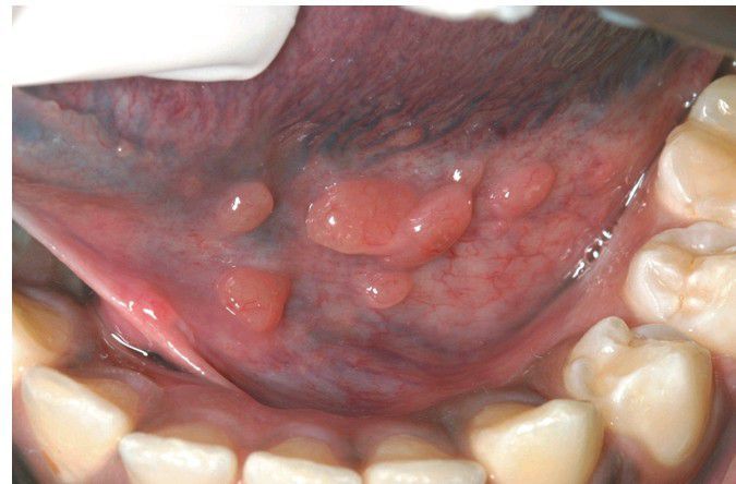 . Multiple prominent lymphoid aggregates in the floor of the mouth.