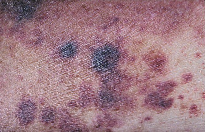 The bruising (purpura) seen on this patient’s forearm is a result of reduced platelet count secondary to myelodysplasia, a preleukemic bone marrow disorder.
