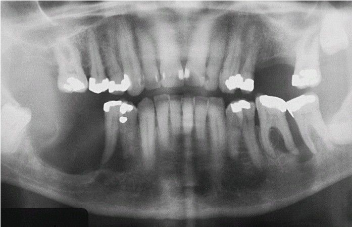 Severe bone loss in the mandibular molar regions that resembles advanced periodontitis.